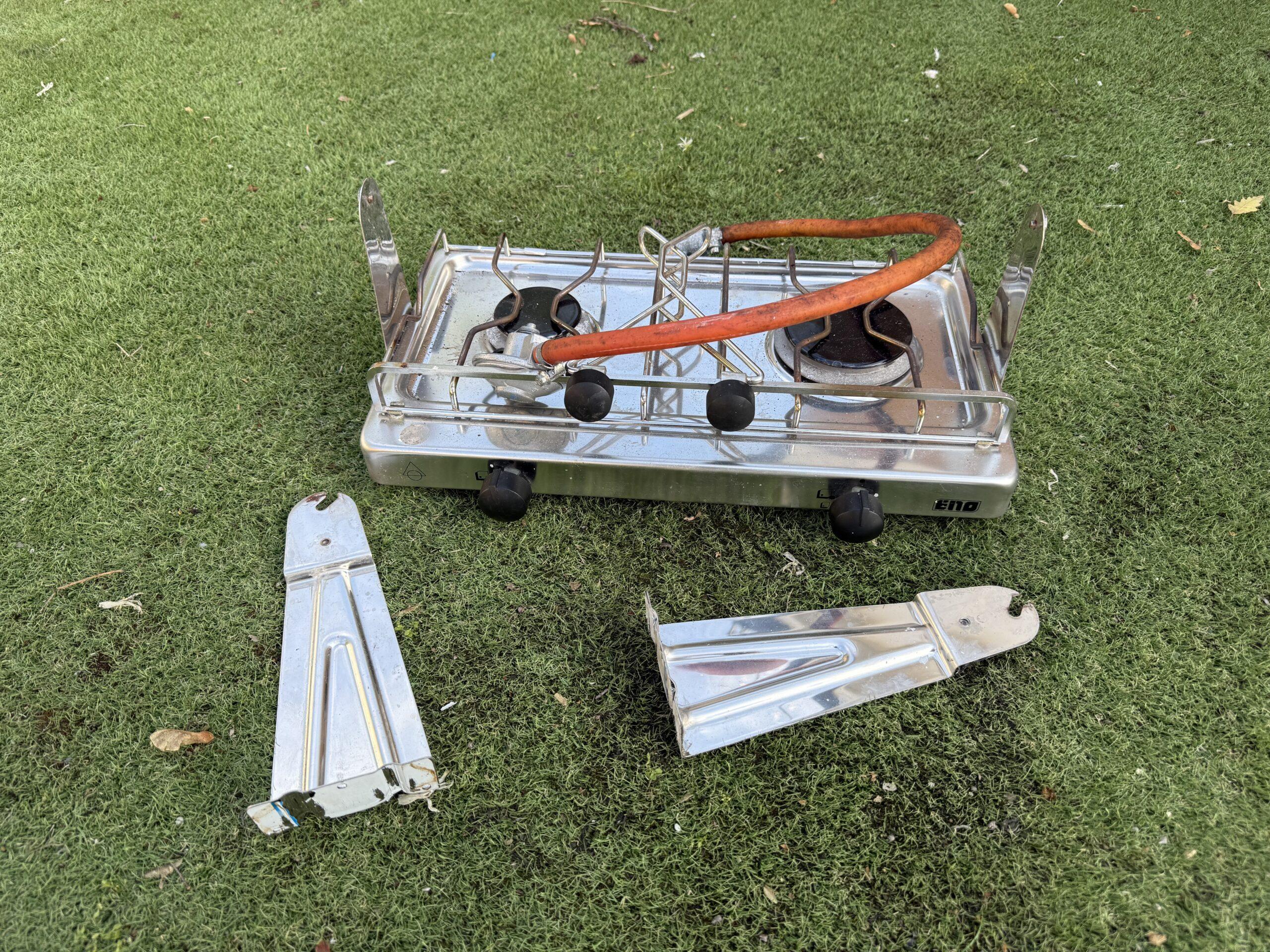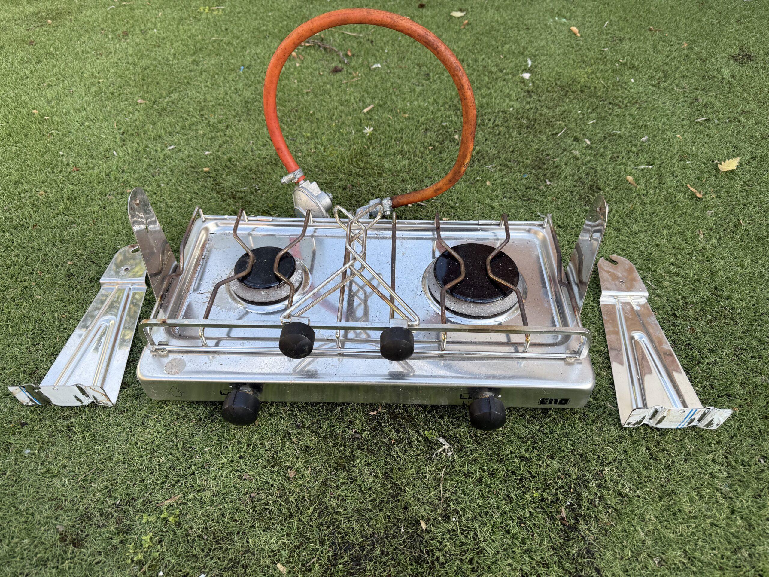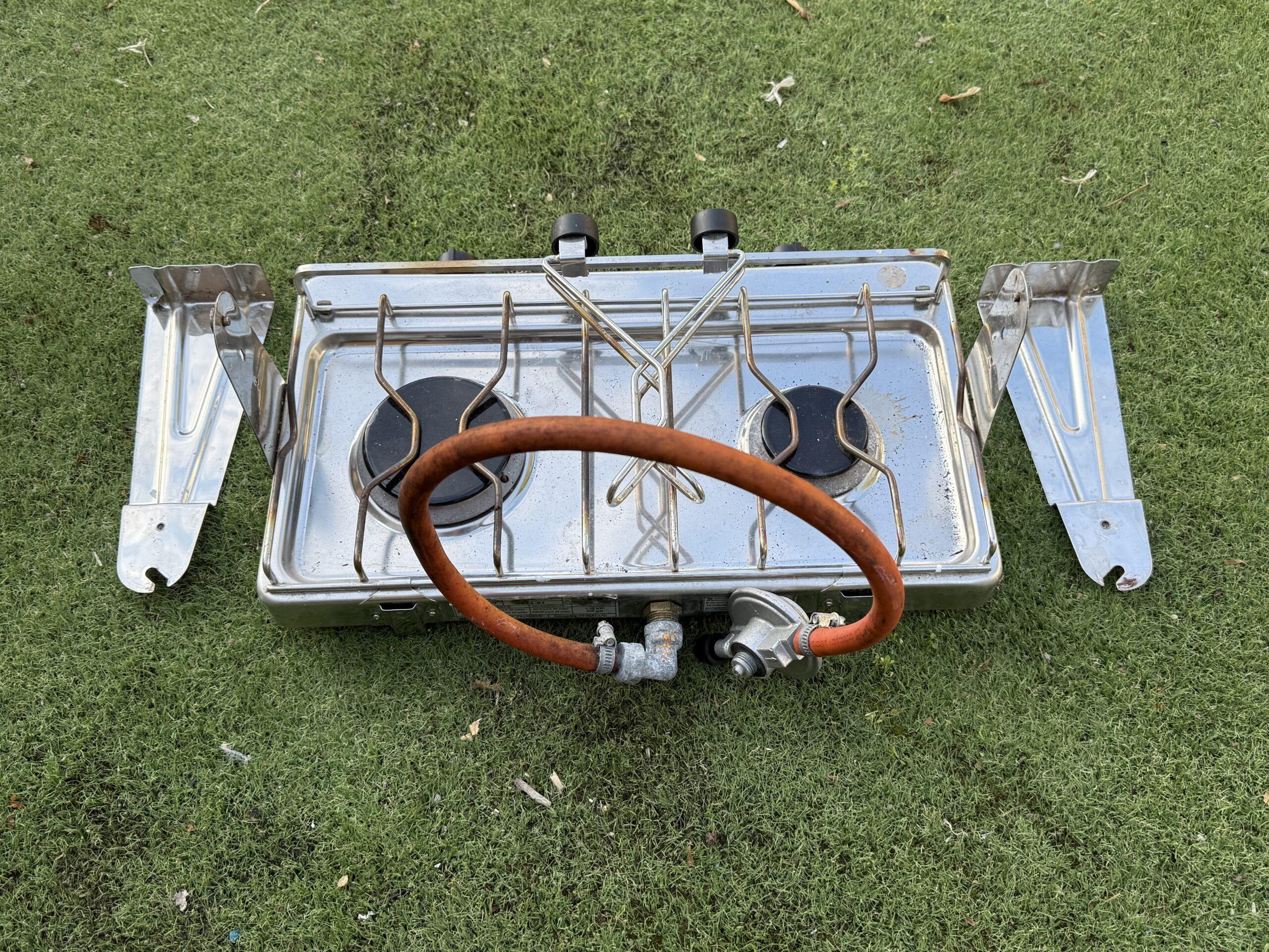 Small 2 Burner Gas Hob Cooker & Gimble for sale. Recently removed from a recycled yacht. Untested but appears to be in good condition.